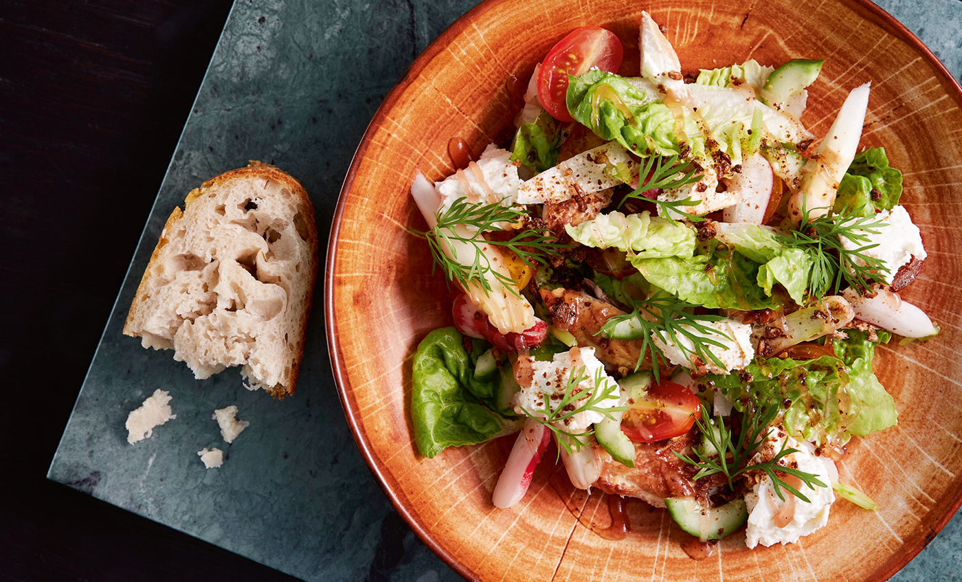 Hæld vinaigrette i en tynd stråle ud over salaten og drys med rugknas og dild.
